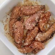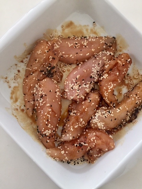 Start med at kom kyllingestykkerne i et fad og vend det godt med sesamolie, soya og sesamfrøene. kom dem i ovnen ved 180 grader og bag dem i ca 20 min.