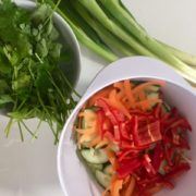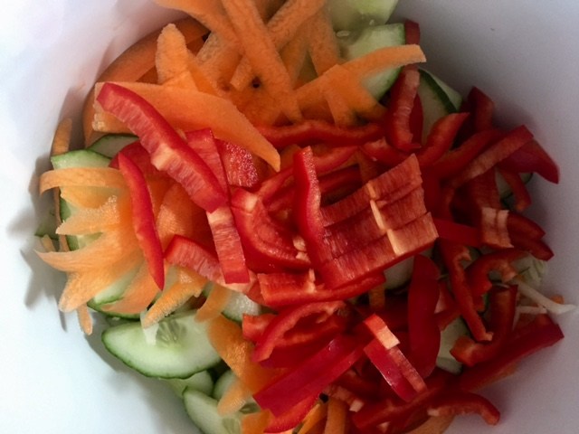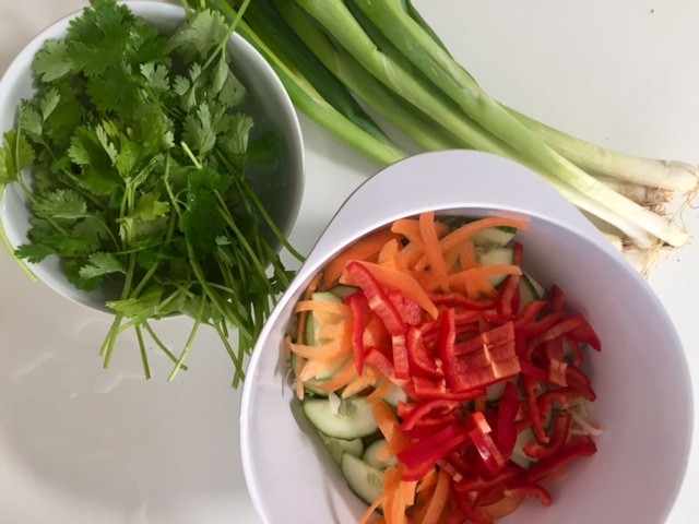 rengør alle grøntsagerne og snit dem i en skål, bland dem godt med de hakkede koriander, lidt olie og salt. kog nu nudlerne til de er klar.