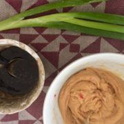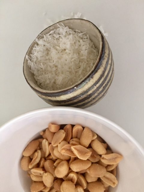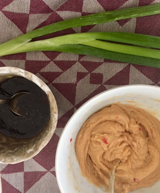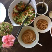 server det hele med toppings som kokosmel og peanuts eller andet du godt kan lide. Spice evt. op med hakket frisk chili. Hvis du har en rest tilbage af peanutdippen, så spis den næste dag sammen med grøntsagsstænger, eller kom den i bolledejen, det gjorde jeg og de smagte fantastisk og selv mine piger som ellers ikke kunne lide peanut dippen kunne lide disse boller.