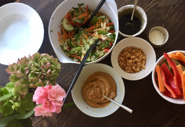 lun nudelsalat med kylling og peanut dip