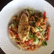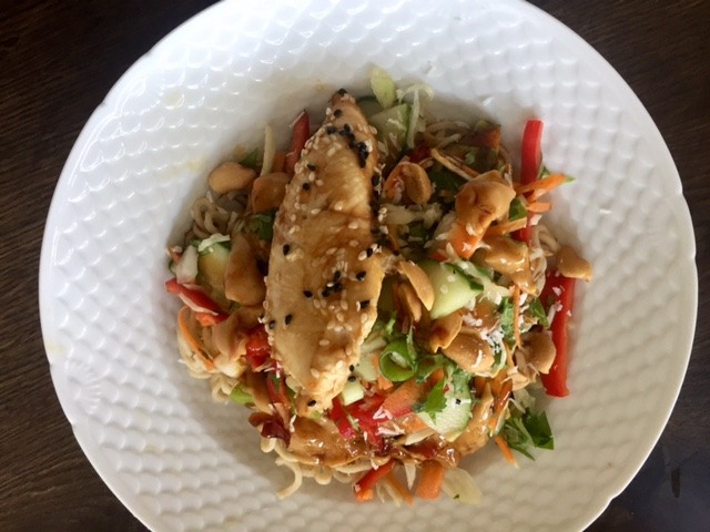 Herren i huset får tit cravings efter noget asiatisk enten nudelsuppe eller som her en lækker nudelsalat. Den kan også laves med oksekød eller fisk hvis man ønsker det. og til de voksne der vil spare lidt på kalorierne kan nudlerne erstattes af finthakket hvidkål eller spidskål. Du kan også spice den op eller ned efter behag. En vinder hvergang.
